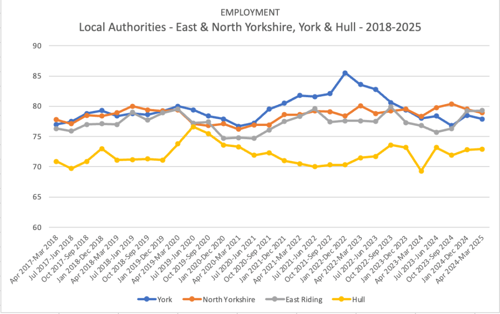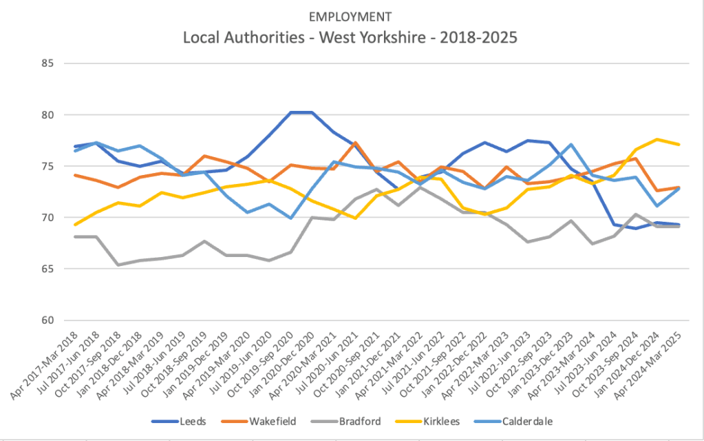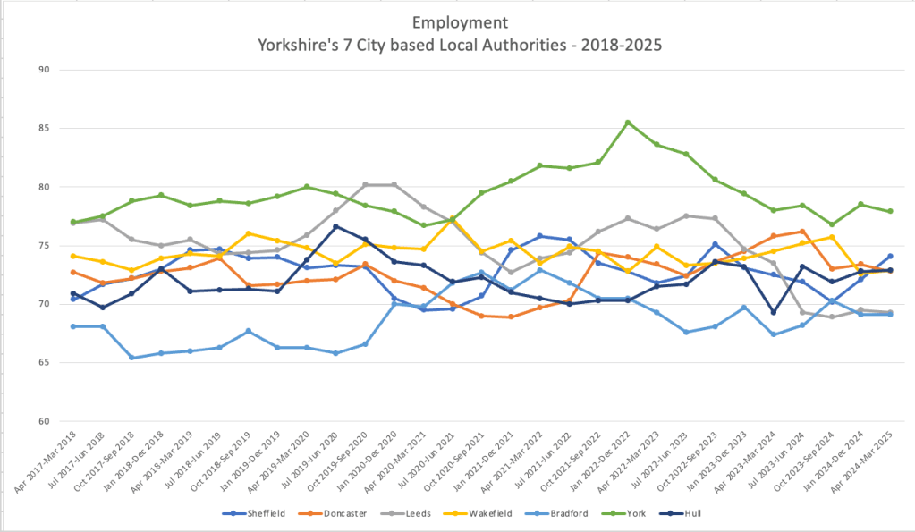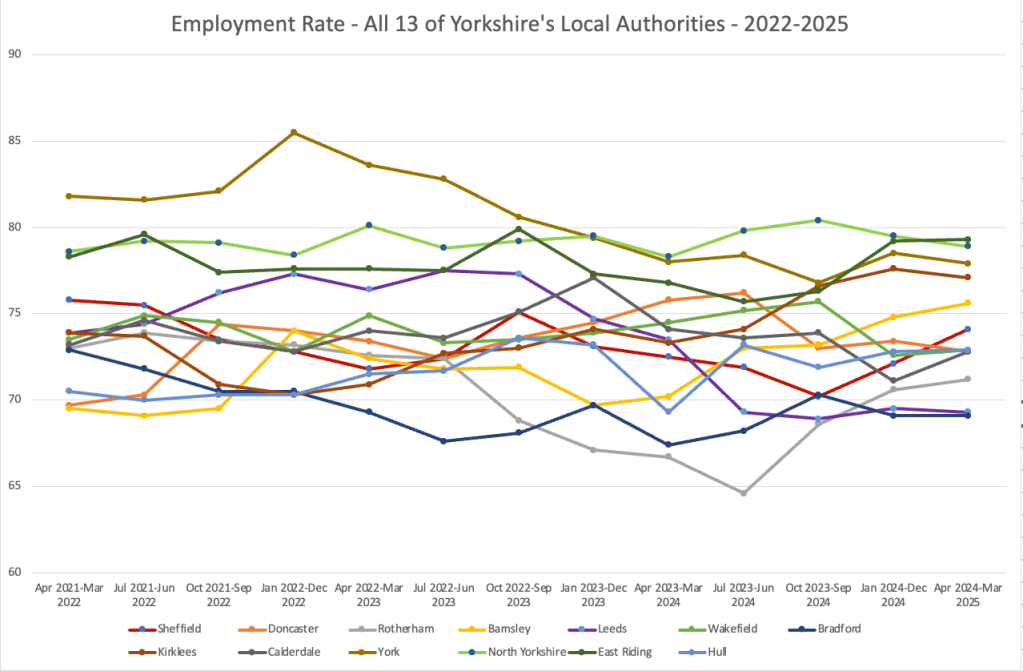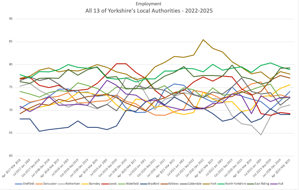 Besides underlining the convergence of Leeds and Bradford mentioned above, as well as York’s long-standing strong performance, the above set of trendlines sees a historically fluctuating Sheffield continue into and through 2025 with the same upward trajectory it entered the year with. Whereas Doncaster, Wakefield and Hull seem to almost exactly the same 73% employment rate.