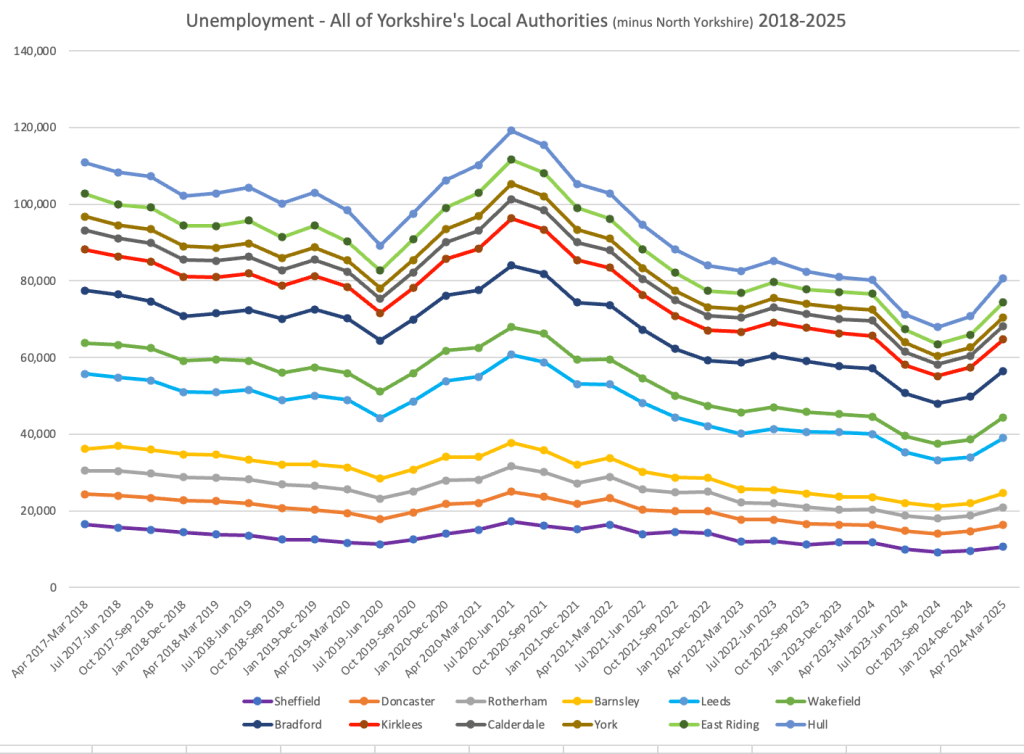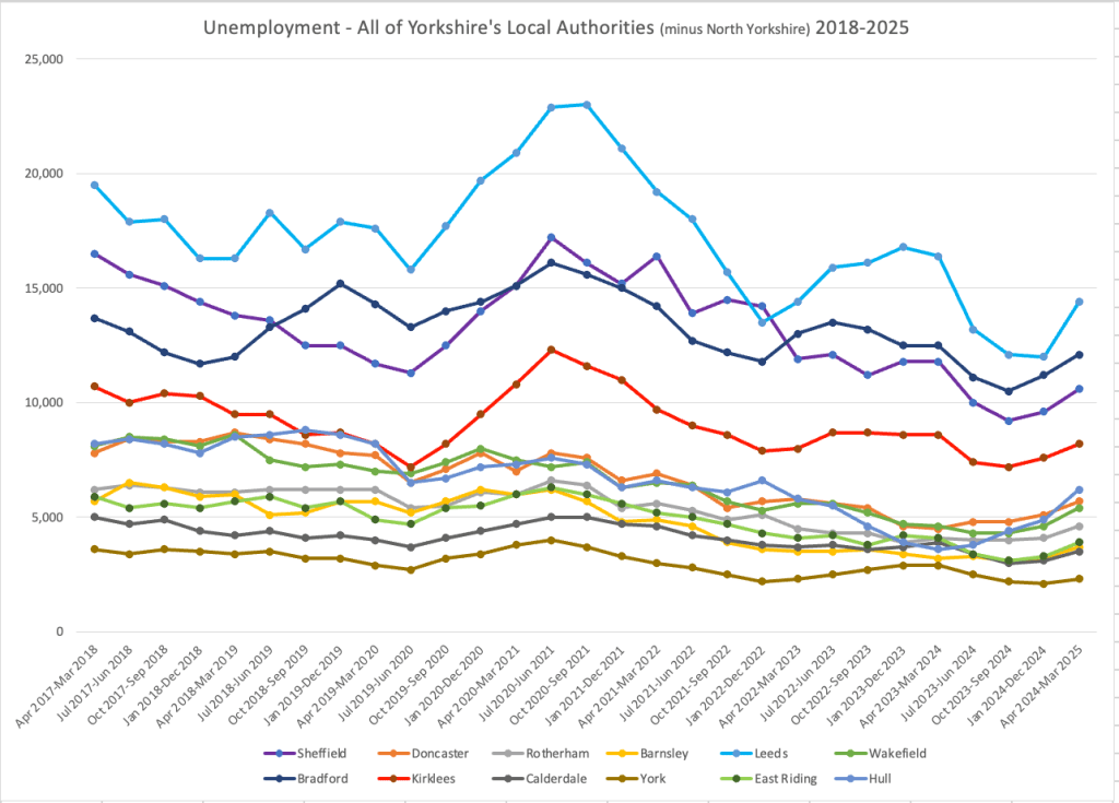 The u-shape for the 2024-2025 period is still evident, even if slightly less pronounced across all councils. However, Sheffield exhibits a pronounced u-shape in this graph as does Bradford and especially Leeds. These three cities, the three largest in Yorkshire, also clearly exhibit the greater volatility which, given their diverse economies compared to the other council areas, isn’t surprising. Leeds exemplifies this point as the largest city and city economy in Yorkshire, presenting a great deal of turbulence over time including a very pronounced ‘pandemic effect’ (coming in and out of the pandemic) and, more recently, having a very pronounced u-shaped trend that sees a current rate of sharply rising unemployment.