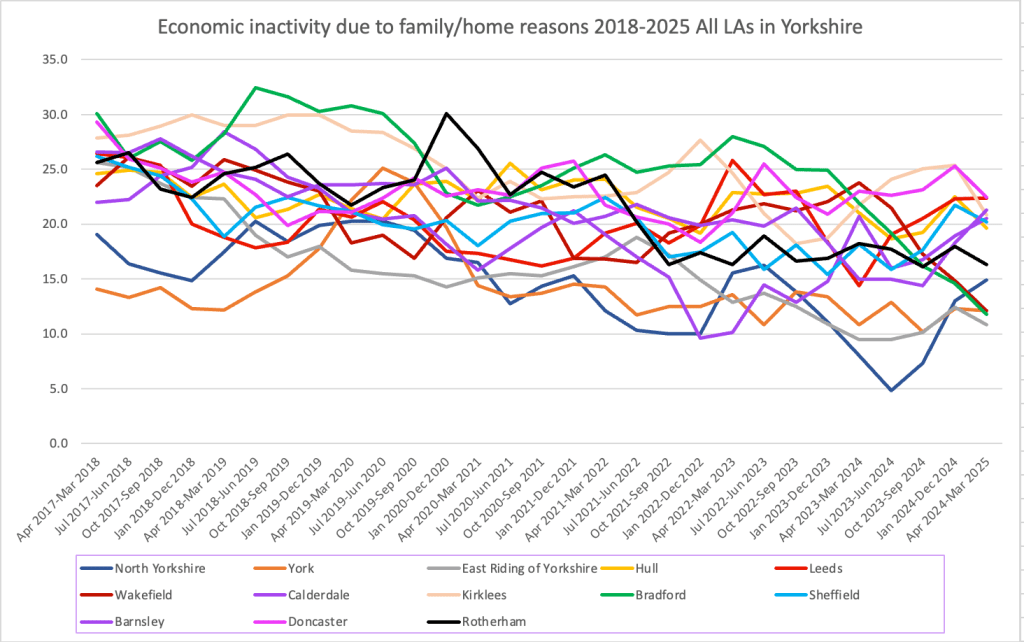 Clearly, entering in the pandemic around 2020, many of the long-term health conditions were those non-covid19 related. As Britain’s labour market came out of the pandemic from 2022 onwards these sorts of reasons would logically have become more of a driver, although the more detailed data on the types of long-term sickness including mental health and musculo-skeletal conditions, can be accessed to examine this. What is notable at a comparative authority-by-authority viewpoint is that despite Hull’s overall dropping rate of economic inactivity up to 2025, it has seen a sharp and continuing rise in economic inactivity due to long-term sickness. York and Leeds saw relative stability, certainly compared to the highly volatile trendlines for all other local authorities in Yorkshire. More notably however in terms of trendline, Only York and Leeds aren’t seeing a rise in this driver of economic inactivity, both hovering at the 22% mark. A new cluster has appeared to have formed however comprising of Bradford, Sheffield, Doncaster, Kirklees as well as North and East Yorkshire, each sitting in 2025 in the 25-28% range.