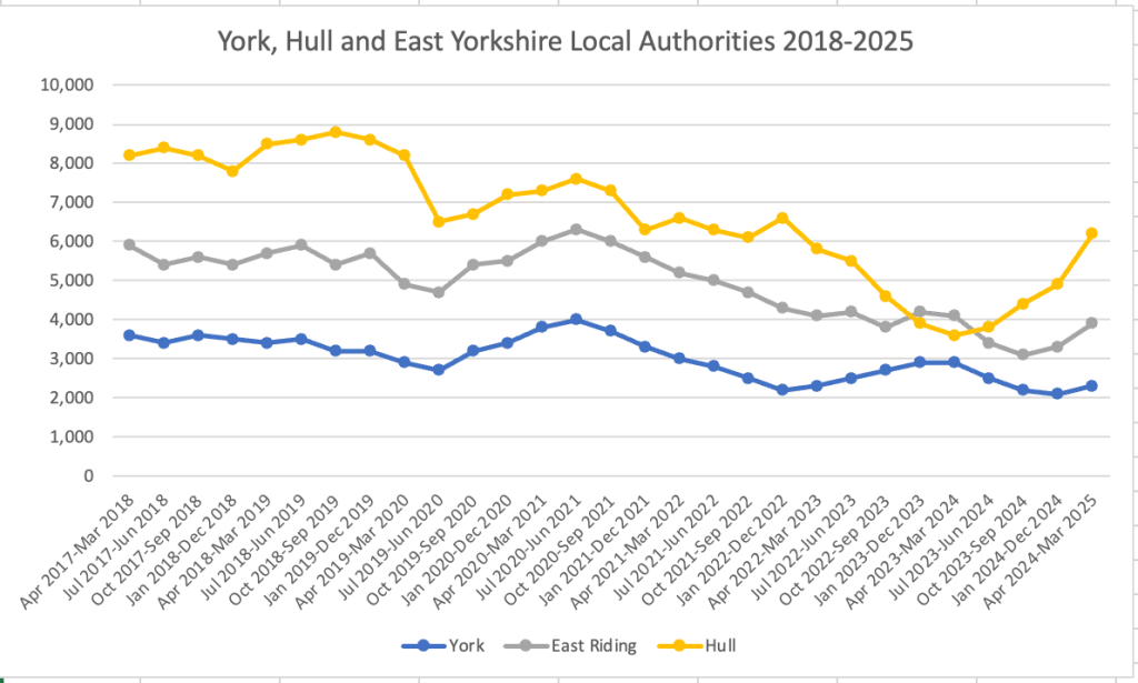 The most volatile trendline, and that which has seen the biggest change, is that of Leeds. Having hit a low mark of 16% at the back end of 2020, it had nearly doubled to 30% by the middle of 2024 and in by the latest statistical release in 2025 is the highest in Yorkshire with the exception of Sheffield. Looking across the 13 authorities, a general pattern can be identified where most were sat in the 20-to-25 percent bracket, with the exception of Kirklees and Bradford whom were above (27 and 28% respectively) whilst North Yorkshire sat below (18%).