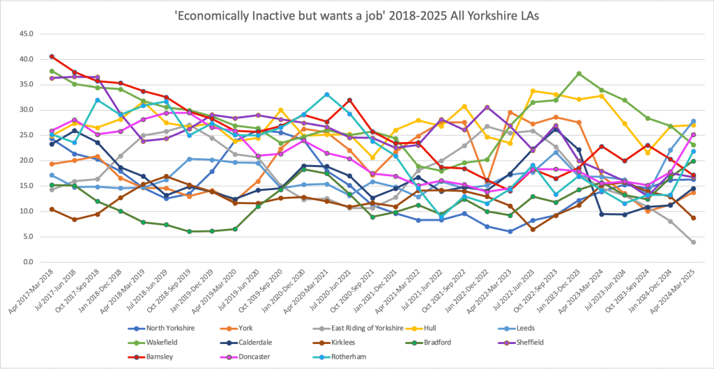 The graphics for each of these will present again a comparative ‘jumble’ for each of the 13 local authorities across Yorkshire as well as separated trendlines in the following areas of economic inactivity: i) topline economic inactivity trends, ii) economically inactive due to long-term sickness, iii) economically inactive due to looking after family, iv) economically inactive but wants a job and v) economically inactive but doesn’t want a job.