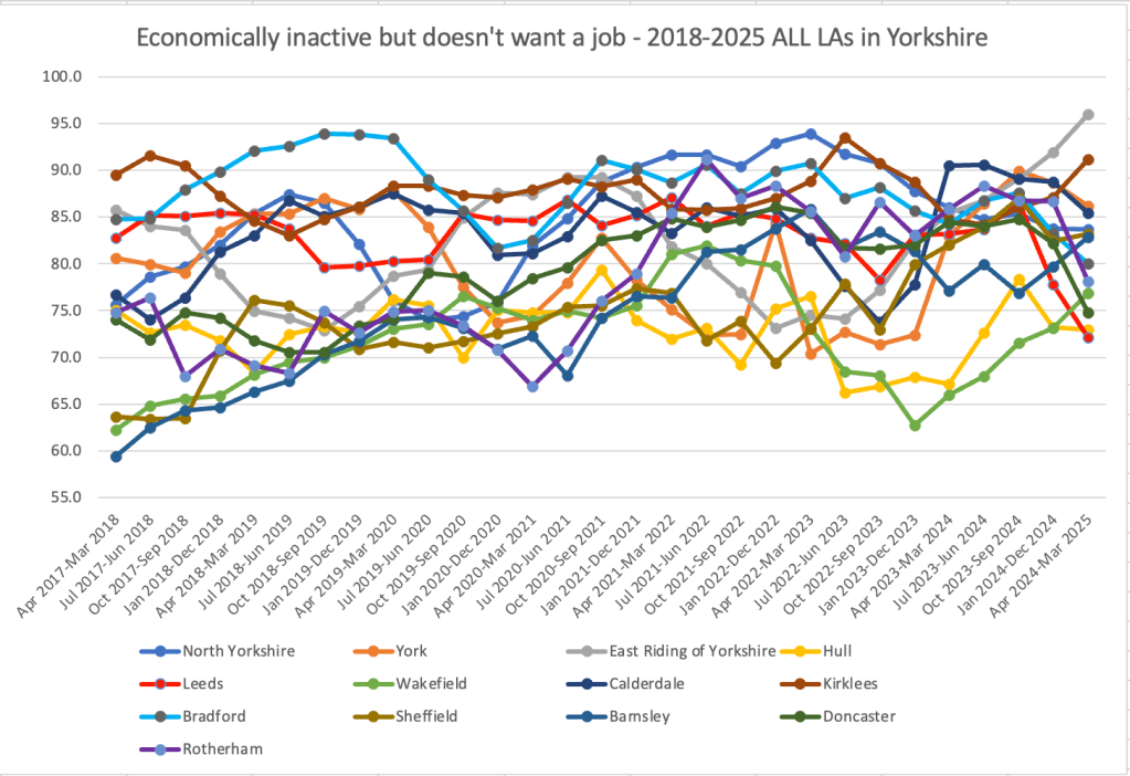 The below chart gives a clearer view of each individual council and its own trajectory on this driver of economic inactivity. A rough division here on the trendlines, and not the rate, between two camps. All of South Yorkshire’s council areas, Calderdale, Bradford and Kirklees each exhibit a clearer post-mid-2023 steady rise, whilst Leeds, Wakefield and each of North and East Yorkshire’s councils are not to the same extent (but still are in most cases).